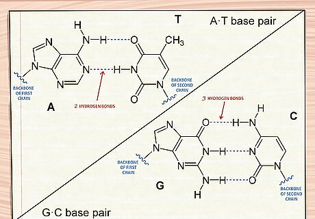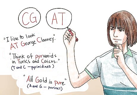 Use mnemonics to remember the base-pairs. Mnemonics are memory tricks to help you remember complex things in an easy way. There are a handful of mnemonics that you can use to remember which bases pair with each other. Choose the one that works the best for you, or make up your own. The “circle” letters C and G pair with each other, while the “stick” letters A and T pair together. Remember the phrase, “I like to look AT George Clooney.” To remember which bases are pyrimidines versus purines: “Think of pyramids in Turks and Caicos” (T and C are the pyrimidines) and “All gold is pure” (AG is the chemical symbol for gold, A and G are the purines). Or, use the phrase “CuT the py” (pie) to remember which ones are the pyrimidines.