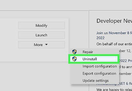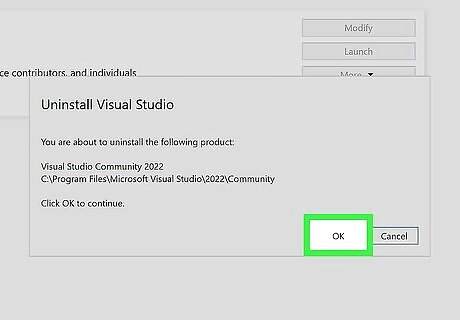 Click Uninstall. This is usually the second option in the menu under Repair. A window will pop up to warn you that you're about to uninstall Visual Studio.