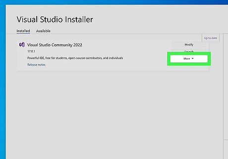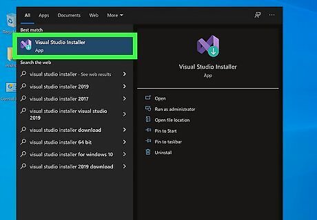 Launch the Visual Studio Installer. You can search for Visual Studio Installer by pressing the Win key, then entering "installer" to search for it. You can also usually find it in "C:\Program Files (x86)\Microsoft Visual Studio\Installer\vs_installer.exe".