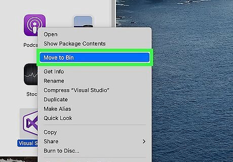 Drag the icon to the trash. Other than dragging the app icon to the trash, you can right-click the icon and select Move to Trash. Although Visual Studio will be uninstalled that way, you'll still have lingering files associated with it. To delete all of them, enter each of the following commands into Terminal (press Return after each line to enter the command): sudo rm -rf "/Applications/Visual Studio.app" rm -rf ~/Library/Caches/VisualStudio rm -rf ~/Library/Preferences/VisualStudio rm -rf ~/Library/Preferences/Visual\ Studio rm -rf ~/Library/Logs/VisualStudio rm -rf ~/Library/VisualStudio rm -rf ~/Library/Preferences/Xamarin/ rm -rf ~/Library/Application\ Support/VisualStudio rm -rf ~/Library/Application\ Support/VisualStudio/7.0/LocalInstall/Addins/ rm -rf ~/Library/Application\ Support/VisualStudio/8.0/LocalInstall/Addins/