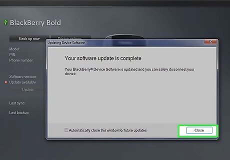 Click on “Close” when the update is complete, then disconnect the Blackberry from your computer. Your Blackberry device will now be updated with the latest software.
