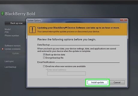 Click on “Install update.” Blackberry Desktop Software will begin updating your device, which may take up to 30 minutes to complete.