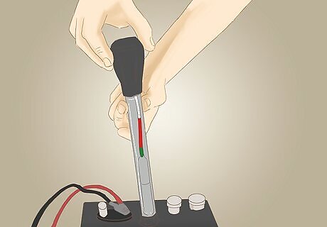 Check the remaining capacity of your battery. If your battery is flat dead, this step may be unnecessary. However, if you are unsure or want to take extra measures to protect your battery from overcharging, you should check the remaining charge with a hydrometer. A hydrometer is a turkey-baster shaped tool that measures electrical capacity as a function of specific gravity by: Carefully removing the battery cell cover as directed by your battery instructions. Squeezing the hydrometer bulb to force out air and maintaining this position. Inserting the nozzle of your hydrometer into the battery cell. Taking the reading of the electrolyte fluid drawing from the cell into your hydrometer. Comparing your reading to the normal reading for fully charged batteries, usually between 1.270 and 1.290. The reading for depleted batteries ranges from 1.130 to lower values.