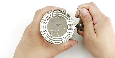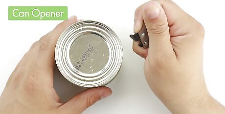Place the flat surface of the can opener and your thumb perpendicular to the rim of the can. The blade should go over the inside edge at the top of the can. The point on the blade will rest on the inside edge, where you want to cut the can.