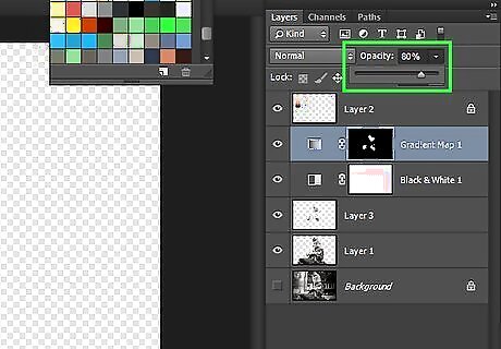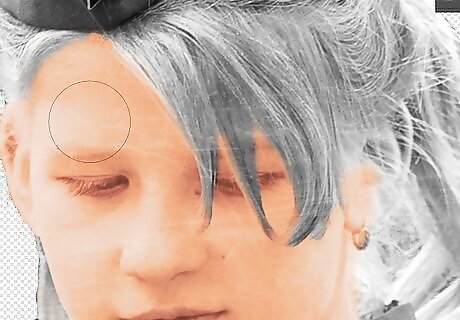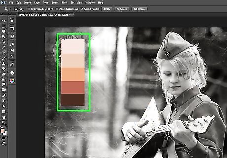 Start building a palette. This will be five skin tones that you will use. Press B for the Brush tool. Make sure the Opacity and Flow are at 100%. Hold down Alt and click on the lightest part of the face. Paint a 'swipe' or a 'stripe' of that color on the same layer. #* Hold down Alt and click on the darkest part of the face. Paint a 'swipe' or a 'stripe' of that color. Repeat the process for the midtones between the two and then repeat two more times, splitting the colors in half each time.