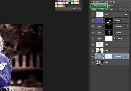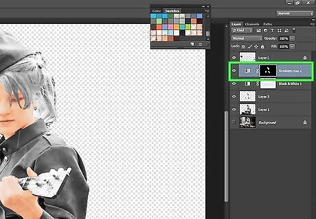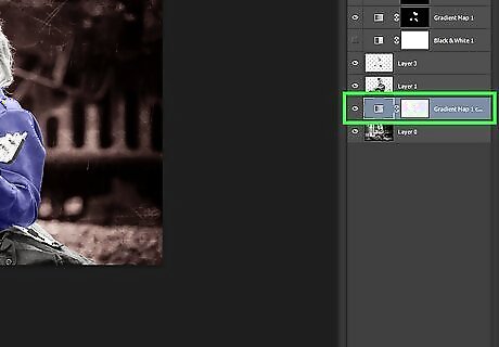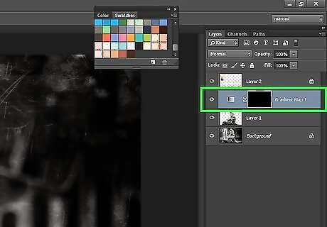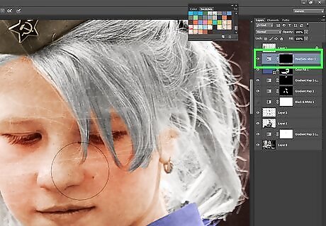 Fill in the mask. In the Gradient Map layer mask, press CtrlDel to fill in the mask and only show the selection; the skin. Since older photos don't have a lot of contrast, you will probably need to fine-tune the mask. Use black on the mask to block out the lips and the eyes, as well.