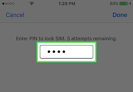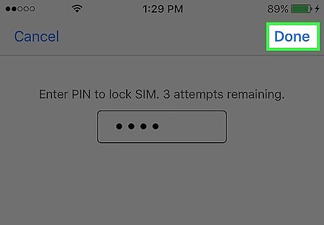 Tap Done. It’s at the top right corner of the screen. The SIM PIN is now enabled. This code (called a SIM PIN) is different from the screen lock passcode, and is only required when turning on the device. Each time you restart your phone after powering it down, you'll see a pop-up screen that says "SIM Locked." To unlock it, tap Unlock, then enter the PIN. You can change the SIM PIN at any time by returning to this screen and selecting Change PIN.
