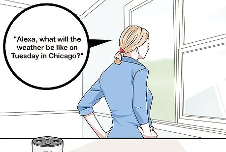 Ask about the weather. Ask about local weather, the weather in a particular city or a weather forecast for either. "Alexa, what's the weather today?" "Alexa, what will the weather be like on Tuesday in Chicago?" "Alexa, is it going to rain?"