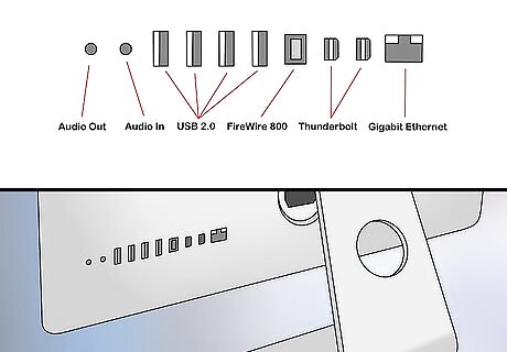 Review your iMac's ports. On the back of your iMac's monitor, there are several different ports which you can use to house various types of equipment: 2 Thunderbolt 3 (USB-C) ports — Narrow, vertical, oval ports. Used for any lightning connectors (e.g., your Magic Mouse and keyboard charger) as well as Mac-exclusive cables and equipment. These ports can also carry Internet and audio. 4 USB 3.0 ports — Rectangular ports. These can be used for flash drives and most external equipment (e.g., keyboards, CD drives, USB hubs, chargers, etc.). 1 Ethernet port — A square port on the right-most side of the row of ports. You can use this port to plug in an Ethernet cable, which can be used to connect your iMac directly to your router. 1 SD card port — A narrow, horizontal port. Used to house large SD cards (e.g., the types found in cameras) or microSD card adapters. 1 Headphone port — This circular, 3.5 millimeter jack is on the left-most side of the row of ports. You can use this output to listen to your iMac's audio via headphones, or you can plug in a set of computer speakers.
