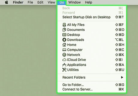 Use the Go menu item. At the top of the screen, you should see a Go menu item; this will appear whenever Finder (or the desktop) is open. Clicking it prompts a drop-down menu with your Finder's list of folders. You can also use the Go menu to access the Utilities folder, which is a system folder that contains applications used to perform advanced actions.