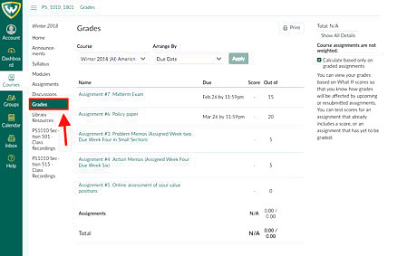 Check your grades. Grades make some of us lose sleep at night, so Canvas has made it easier for students to check their grades straight from the Dashboard. Click on the dashboard icon in the navigation bar on the left. Click on the "View Grades" icon in the bottom right-hand corner to view grades for all of your enrolled courses. Another method to check grades is by going directly to the specific class and clicking on the Grades tab in the menu of the course. Here only grades for that class will be shown.