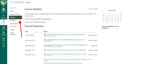 Read the course syllabus. Every class contains a course syllabus of an overview of assignments, projects, and exams for the semester. In your dashboard, click on any specific course. Click on the "Syllabus" option located on the left bar of the course and read the information provided.