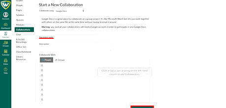 Complete group assignments. Canvas allows students to work together and share notes straight from the site through Google Docs or Office 365. Inside of the course, click on the "Collaborations" icon. Choose between using Google Doc or Office 365 and create a new document by entering in the title. Select the people from your roster that you want to collaborate with. Once you have selected the people you want to work with, select the "Start Collaborating" icon on the bottom right corner.