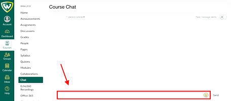 Chat with your professor. Canvas provides a fast and easy messaging option that allows you to talk with your professor without having to send an email. Inside of your course, click on the "Chat" icon located on the left bar. Type in your message to your professor in the empty bar and press send when complete.