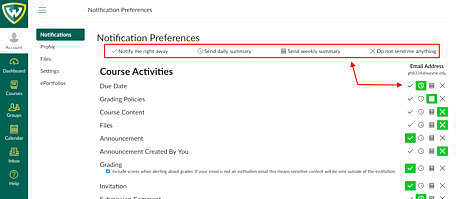Update your notification preferences. Canvas will send you an email notification when you receive an announcement or have an assignment due based on your notification preferences. Click on the "Account" icon on the left side of the navigation bar and click on "Notifications." Highlight the times that you would prefer an email notification based on the graphics provided at the top. Ensure the times you have chosen are highlighted in green, and it will automatically save for you.