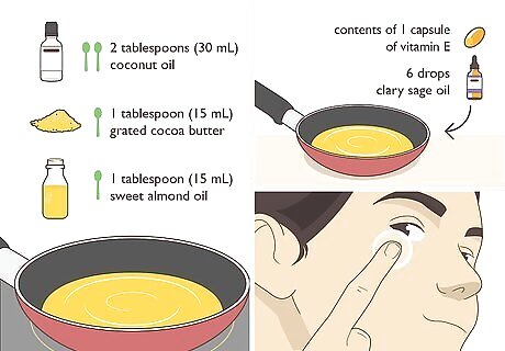 Use clary sage to reduce the appearance of wrinkles. Combine 2 tablespoons (30 mL) of coconut oil, 1 tablespoon (15 mL) of sweet almond oil, and 1 tablespoon (15 mL) of grated cocoa butter in a small pan. Heat it over low heat, stirring the mixture until it’s well combined. Remove the pan from heat and stir in 6 drops of clary sage oil and the contents of 1 capsule of vitamin E. Transfer the mixture to a small jar with a tight-fitting lid and allow it to cool overnight at room temperature before using it. Applying a small amount to your face, neck, and/or under-eye area after cleansing your face at night can help reduce the appearance of wrinkles, but keep in mind that it won’t get rid of wrinkles. Clary sage has antioxidant properties, preventing your skin from being damaged by free radicals. This cream is great for sensitive skin.