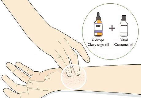 Treat dry skin, rashes, and itchy or swollen skin with clary sage cream. Clary sage has been scientifically proven to improve the texture and condition of your skin and is especially useful in treating psoriasis. Combine 6 drops of clary sage oil with 1 fluid ounce (30 mL) of coconut oil then rub it directly onto your skin. Test a small area of skin with a little bit of the mixture before applying it to larger areas of your body. Keep in mind that clary sage is not a sure-fire solution for treating serious skin conditions. Talk to your doctor and/or dermatologist before using clary sage to treat skin issues.