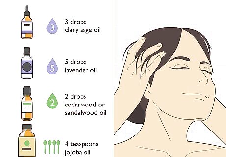 Get rid of dandruff with a hot clary sage oil treatment. Clary sage’s antifungal and antibacterial properties can help treat a dry, flaky scalp. Mix together 4 teaspoons (20 mL) of jojoba oil, 3 drops of clary sage oil, 2 drops of cedarwood or sandalwood oil, and 5 drops of lavender oil. Use your fingers to massage 2 teaspoons (9.9 mL) of the mixture into your scalp. Soak a small towel or washcloth in hot water and wring it out until it’s not dripping then wrap your head it for 1 hour before shampooing your hair. You can reapply the mixture 2 or 3 times during a single treatment. Once the towel cools, remove it and massage the mixture into your scalp again before wrapping it with the hot (reheated) towel. Do this treatment once every two weeks to prevent dandruff.