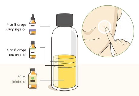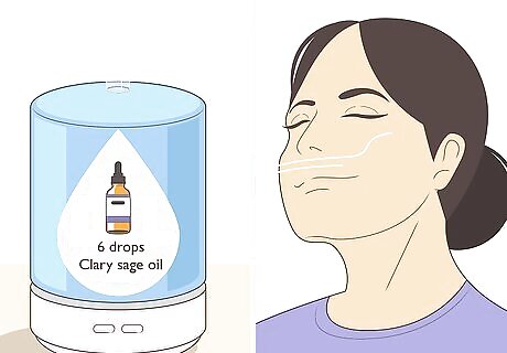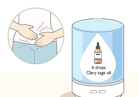Diffuse clary sage to ease painful cramps during menstruation. Inhaling the scent of clary sage has been scientifically proven to help fight off depression, menstrual cramps, and other symptoms that arise during your monthly cycle. Put 4 to 6 drops into an oil diffuser or blend 6 drops of clary sage oil with 1 fluid ounce (30 mL) of coconut oil and rub it onto your lower abdomen to ease cramps. You can also add 4 to 6 drops of clary sage oil to warm bath water. Keep a bottle of clary sage essential oil with you and sniff it for on-the-go relief. Lavender and rose oil can also help to relieve cramps, so try adding a few drops of each of these if clary sage alone does not help.