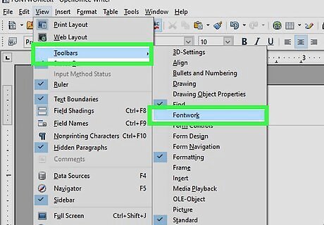 Open the Fontwork Gallery. You can do this by clicking the hanging picture icon with "A" inside it. If the Drawing toolbar is not visible, make it visible by going to View > Toolbars > Fontwork.