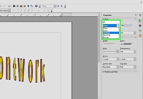 Use the Formatting toolbar. With this tool, you can go further and customize the Fontwork object with several more attributes. The options and icons shown here will vary depending on the version of Open Office you're using. You can change the lines in your Fontwork as well as the coloring, gradient, and fill color.