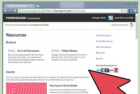 Integrate your Foursquare business with your website. You can add different Foursquare plugins, such as “Save” or “Follow,” to your business website so customers can easily locate your business via Foursquare and can add tips to your Foursquare business page. Visit the “Foursquare Resources” page at https://foursquare.com/about/logos to create a customized Foursquare button to add to your website. You will see two buttons: “Save” or “Follow” at the top of the page. The “Save” button allows your visitors to save a venue so they can visit it later. The “Follow” button allows your visitors to follow your business page using their own Foursquare accounts. Click on one of these buttons to open the code-generating page. Enter your Foursquare business page URL in the “Foursquare URL of your Page” field and hit the “Submit” button next to it. Select a button style then copy the entire generated code from the “Grab the code” box at the bottom of the page. Access the dashboard of your website and paste the copied code on your website. Save your changes and publish it to activate the Foursquare button on your website. Your web visitors can directly browse your Foursquare business page using the button and see the published tips on your Foursquare business page.