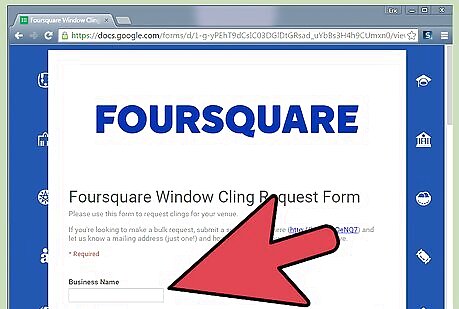 Use Foursquare window clings, stickers, or signs at your physical business store. If you have a physical store (that is, not an online store), you can encourage your customers to view your Foursquare business page by using Foursquare window clings, stickers, or signs. Go to Foursquare Window Cling Request form (https://docs.google.com/forms/d/1-g-yPEhT9dCsIC03DGlDtGRsad_uYbBs3H4h9CUmxn0/viewform). Fill in each required field in the form accordingly and select a cling type from the available list. Click on “Submit” to send your request for a Foursquare window cling, and Foursquare will send your requested cling to the address specified in the form. To request clings for multiple locations, use the support ticket of Foursquare.