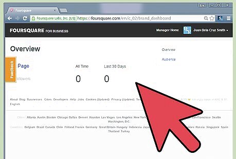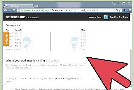 Monitor analytics of your business page. You can easily track the metrics of customers and their activities on your business venue by accessing to your Foursquare Business Manager option. You can monitor the data of your customers depending upon customer types, location, gender, and periods. Visit your “Manager Home Page” on Foursquare to view the list of Customer Statistic on your business page. Click one of the listed data to check its detail information.