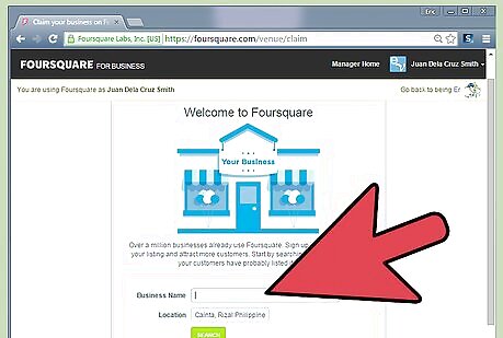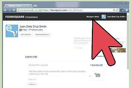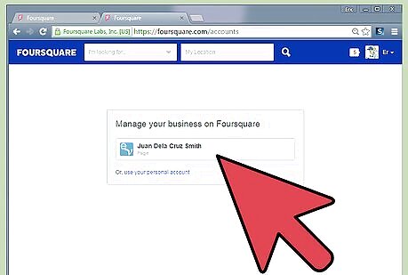 Switch your Foursquare personal account to a business account. To enable and access the business tools on Foursquare, you must switch your personal account to a business account using your new business page on Foursquare. Log into your business page at http://business.foursquare.com. Click on “Log in” at the top right corner. Enter the registered email address and password of your personal account in the required fields then hit the “Log in” button. After logging in, you will see a “Manage your business on Foursquare” dialog box on your screen. Here you will see a “Business page” tab and “Personal account” tab on the dialog box. It will ask whether you want to use Foursquare as your business page or as an individual user. Click on the “Business page” tab to switch your personal account to a business account. If you have logged into your Foursquare account as an individual user, you can convert your account temporarily into a business account by switching it to your business page. Do this by moving your mouse pointer over the profile picture at the top right corner to open a drop-down menu. Click on the “Switch accounts” tab to change your Foursquare user account to a business account. Now you can access the business dashboard.