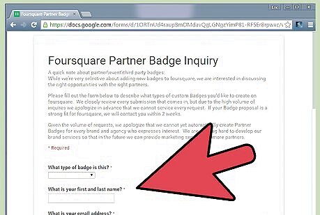 Create your custom business badge to reward your customers. You can encourage people to check into your business venue and collect different badges as a reward. Foursquare users will be interested to check into your venue page to win different badges as this can highlight their own profile. To create a custom badge, you must apply via Foursquare Partner Badge Inquiry form and get the approval of the Foursquare admin. It is a paid business feature. To apply, you must agree to run the custom badge at least for three months at $25,000 per month. Go to the Foursquare Partner Badge Inquiry form (https://docs.google.com/forms/d/1ORTnUd4raupBmDMdavQgLGNgzYimP81-RF5Er8rpwxc/viewform?ndplr&formkey=dHNhdHhZNXZtM0tkbTN0YUIxVjlnLWc6MQ&hl=en). Choose the “Type of badge” from the drop-down menu on the form. Then fill up all the required fields on the form. When you are done, click the “Submit” button at the bottom of the form to send your application to the Foursquare admin; they will review your application. The Foursquare team will contact you via the email address you gave on the form within 2 weeks to inform you about the approval or disapproval of the requested custom badge. If your badge is approved, you must pay the fee of the badge (instructions will be included in the email). Generally, it takes 6 to 8 weeks to get the badge live on your business page.