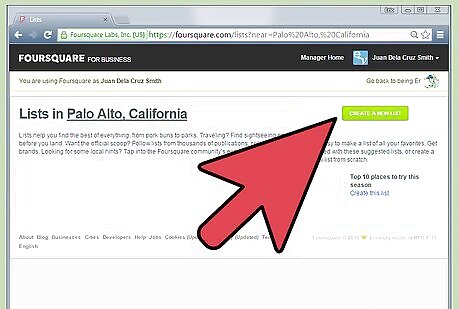 Create lists of recommended locations on your business page. Recommended venues on your business page will help customers and other Foursquare users find great places. It can also encourage customers to create their own lists and add your business venue on their list as a favorite venue. Go to the “Foursquare list” page at https://foursquare.com/lists. Click on “Create a New List” at the top right corner of the page, and a “Create a new list” dialog box will appear on your screen. Type the title of your list in the required field and hit the “Create” button to begin. Your list page will appear with available listing options. Type the list description in the “Description” field to let people know about the type of venues listed on your list, and click on “Save.” Type the name of venues in the “Search for a place” field. While typing, you should see different suggested venues on to help you find the venue quickly. Choose one of the suggested venues to enlist it. You can add an image to your listed venue by clicking on the “Add a photo” box next to the venue title. Continue adding more venues by searching for them. When you are done, click on the “Finish editing” button at the top right corner to save the added venues under this list. Now, share this list on other social media platforms to let people follow it on your business page. Do this by selecting the list to share then clicking on one of the “Share via” buttons on the right sidebar—you can select Facebook, Twitter, or Email. If you have not linked your Foursquare business account to these social accounts, you will be asked to log in.