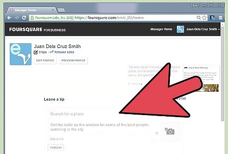 Publish merchant tips related to your business on different locations. It is important to publish tips related to your business using the “Leave a tip” box on your business page. You can publish updates regarding your business at your business location and at other neighboring locations. Click on the “Manager Home” tab at the top of the page to access to the “Leave a tip” box. Search a business venue on the “Manager Home” page. You can search for a venue within a specific location by setting the location parameter at the top of the “Tips” box. To search for another location, click on the location link at the right side of the “Search for a place” box and type the location name there. Now, select the location from the results. On the next screen, enter tips regarding your business promotions or updates in the tip box below. You can also attach an image with your tips by clicking on “Add a photo” on the right side and uploading the image from your computer. Enter any tip-related link in the “Add a link” field if you want to drive your customers to know more details about your business. Click the “Publish” button below to update your tip on the selected Foursquare page. #* Try to publish tips on other neighboring and relevant location pages to attract new customers to your business.