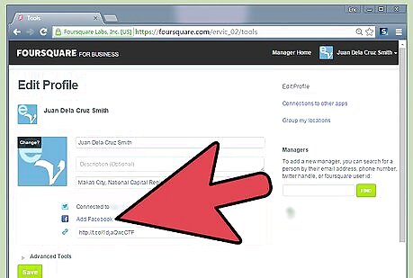 Link your Facebook and Twitter business page to your Foursquare business page. Go to the “Manager Home page” of your Foursquare business page and click on the “Edit profile” button next to the profile picture at the top left corner of the page. Click on the “Add Facebook” and the “Add Twitter” link one by one. Log into your Facebook and Twitter business accounts on the pop-up windows that appear. After linking all accounts, click on the “Save” button below to connect your Foursquare account to Facebook and Twitter.