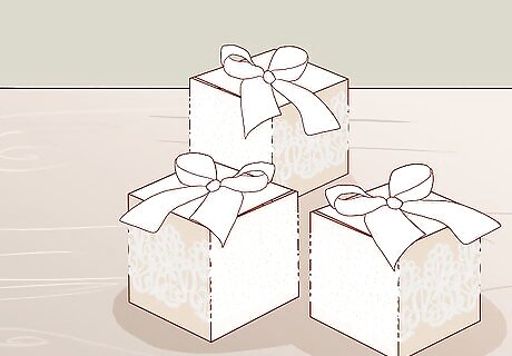 Hand out lace wedding favors. When assembling wedding favors, wrap them in lace. You can, for example, tie a lace bow around jars of honey you're giving out to guests. You can also use lace sacks to hold small gifts for wedding guests. Lace and burlap go well together. Try decorating a burlap sack in lace and store wedding favors in here.