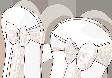 Decorate seating with lace. Add lace bows to chairs. You can wrap a delicate lace bow around every chair or add them to the ends of pews if you're marrying at a church. If you have floral arrangements hanging from the seating, add a lace bow to flower pots or bouquets. It can be a nice touch to hang floral arrangements over each row of seats. Such arrangements can be embellished with lace bows. If you're hanging bouquets, you can bind them using lace.