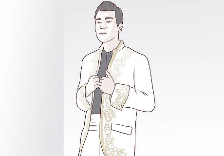 Embellish menswear with lace. Traditional menswear, such as suits, can also be embellished with lace. If you or your spouse prefer menswear for the big day, incorporate lace into that. Trousers, shorts, and hats often use touches of lace, especially when designed by modern designers. See if you can find lace versions of these outfits. If you're wearing something like a jacket or blazer, look into getting it lace-lined.
