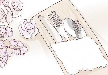 Wrap silverware in lace. If you're having a formal dinner at the reception, try wrapping silverware in a lace bow. You can also wrap silverware in lace napkins. This can go nicely with lace tablecloths or table runners.
