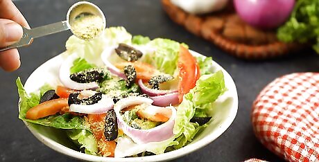 Sprinkle nutritional yeast on salads. Nutritional yeast will add a mild, savory flavor. The high water content of many greens, like lettuce, can reduce the natural dryness of the yeast. Layer the yeast atop salads to suit your tastes. If you enjoy using nutritional yeast as a salad topping, you might want to store the yeast in a wide-holed shaker, like the kinds used for parmesan cheese.