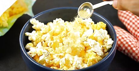 Use nutritional yeast as a popcorn topping. Transfer your popcorn to a large bowl. If it doesn't already have butter on it, drizzle the popcorn lightly with olive oil and toss the popcorn to distribute the oil. Sprinkle with nutritional yeast while continuing to toss the popcorn to distribute the yeast evenly throughout the popcorn. Feel free to add other toppings to the popcorn. Popular choices include garlic, dried thyme, rosemary, pepper, and lemon pepper. Nutritional yeast has zero sodium. If you’re watching your salt intake, leave out the salt when making your popcorn and add nutritional yeast instead.