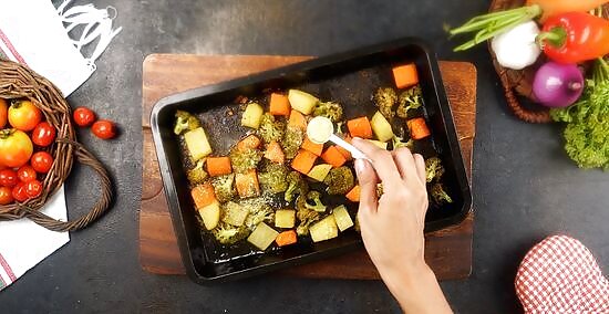 Garnish roasted vegetables. As soon as the vegetables are done roasting, if they are dry, drizzle or brush them lightly with olive oil. After that, dust the veggies with nutritional yeast. This will give the roasted veggies a cheesy quality.