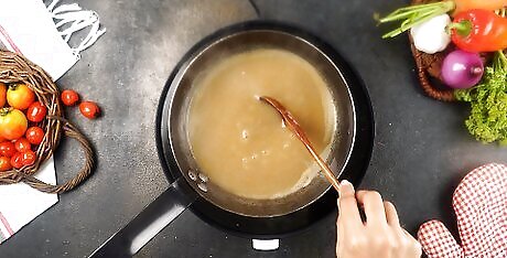 Make gravy with nutritional yeast. Position a medium-sized skillet over medium heat. Add ½ cup (118 ml) of nutritional yeast to the skillet and toast the yeast while stirring constantly until you can smell the yeast. Then: Add 1/3 cup (79 ml) of vegetable oil to the yeast. Whisk the mixture. It should bubble and brown. When golden, add 1½ cups (355 ml) of water to the mixture while continuing to whisk. Stir in 2 tbsp (30 ml) of soy sauce into the mixture when it reaches gravy thickness. Add salt and pepper to taste.