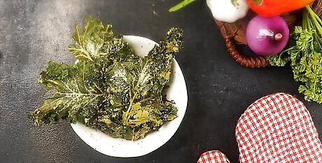 Season kale chips with nutritional yeast. Kale chips are already a pretty healthy snack, but they can be made even healthier by substituting nutritional yeast for salt. If salt consumption isn’t a concern of yours, try sea salt, cracked black pepper, and nutritional yeast together on kale chips. Create a spicy topping for your kale chips by combining the following in a food processor: 2 tbsp (30 ml) of nutritional yeast, 2 tbsp of lemon juice, 1 tsp (5 ml) ground chipotle pepper, ½ tsp (2.5 ml) of sea salt, ¼ cup (59 ml) of cut red bell pepper, 1 cup (237 ml) of cashews (soaked in water for 2 hours), a pinch of cayenne pepper. Add these processed ingredients to your kale before baking it.