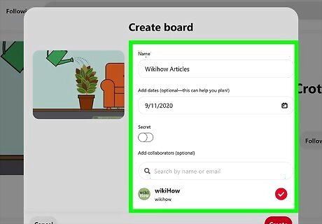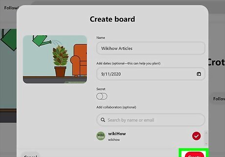 Fill out your board's basic information. Enter a board title that's reflective of the sort of content you'll be saving to this board. For example, if you're saving a haircut idea, you could use something like Curly Haircuts or Hair Ideas. If you're using a phone or tablet, you also have some optional decisions to make now: If you don't want anyone to see your board, you can toggle the "Secret" switch to the On position. If you want to collaborate on the board with someone else, tap the button under "Collaborators" to choose someone.