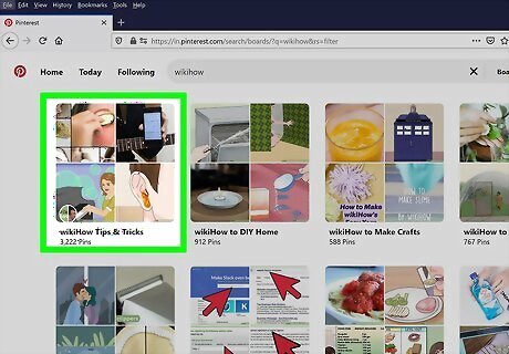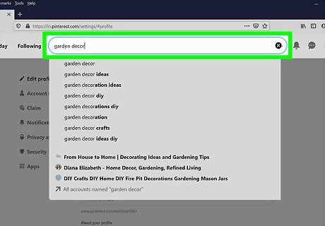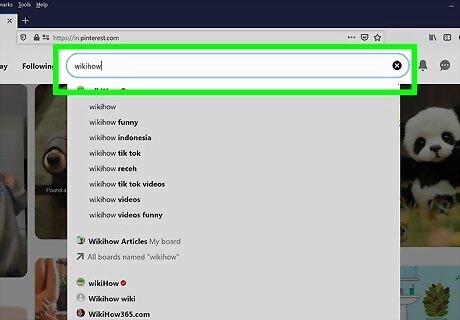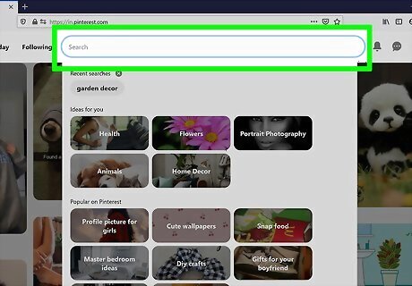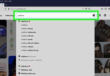 Search for a term related to your preferred content. For example, if you want to follow a board that posts pictures of kittens, you might type "kittens" into the search bar. If you're looking for a specific person, type their username (or their name, if you think they use it on Pinterest).
