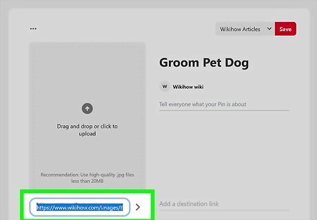 Create a Pin from a photo. If you want to create a Pin by saving a website directly, skip this step and move to the next. To create a photo Pin: If you're using a phone or tablet, select a photo and tap next. If you're on a computer, click the large box with an arrow inside, select the image, and then click Open. Enter a title and description. If you want people to be able to find your Pin in searches, make sure to be descriptive and use relevant keywords. If you want the Pin to link to a website, click or tap the Destination option and paste the desired URL. Select a board for the Pin. If you're on a phone or tablet, tap Next and select the board. If you're on a computer, choose a board from the drop-down menu and click Save.
