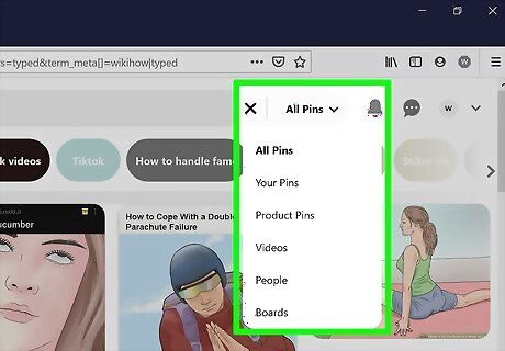 Filter your search results. You can filter the results to show only People or Boards that match what you've typed. If you're on a computer, click the menu to the right of the search bar that says All Pins and select a filter option. If you're on a phone or tablet, tap the filter icon that looks like sliders at the top-right to select an option.