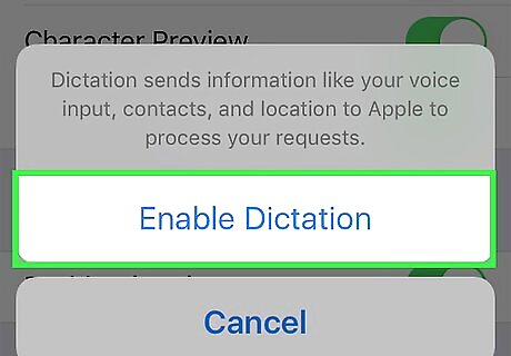 Enable Dictation. You'll need to enable Dictation in order to use it. Like Siri, Dictation recognizes your speech, allowing you to type by talking. Dictation will send your spoken text to Apple's servers to be recognized and processed. Open your iPhone's Settings. Tap General. Tap Keyboard. Slide Enable Dictation right to "On".