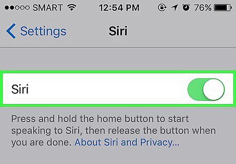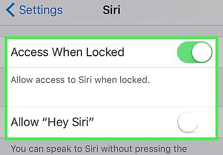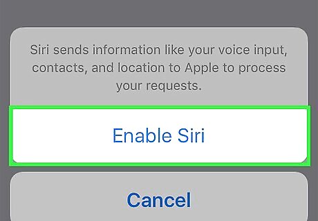 Slide the Listen for "Hey Siri" button or Press Home for Siri button right to the "On" position. Depending on how you want to use Siri, slide either or both of these switches to the green "On" position. You can also enable Siri while your phone is locked by sliding the Allow Siri When Locked button to the "On" position. You should see a pop up window at the bottom of the page when you enable Siri.