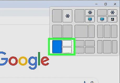 Choose a split screen layout from the menu that appears. After hovering the maximize button for a moment, a menu with a number of split screen options will appear. Mouse over and click on the split screen layout that you prefer. There are several split screen options available. Some are for two windows only, while others will allow you to have three or four total windows open on your screen at the same time. Depending on the programs you have open, you may see program icons in some of the boxes in this menu. If you see this, it means the program will be moved to that part of your screen automatically, without needing to specify it.