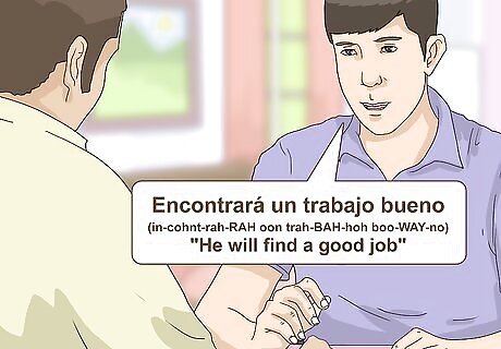 Make predictions about the future in simple future tense. The future tense in Spanish recognizes that you can't literally predict the future. If you believe something will happen in the future, but have no guarantee that it will take place, use the simple future tense. For example, if you have a well-educated and experienced friend who is currently seeking employment, you might say "Encontrará un trabajo bueno" (in-cohnt-rah-RAH oon trah-BAH-hoh boo-WAY-no, in English "He will find a good job"). You have reason to believe that this will happen, but there is no guarantee.
